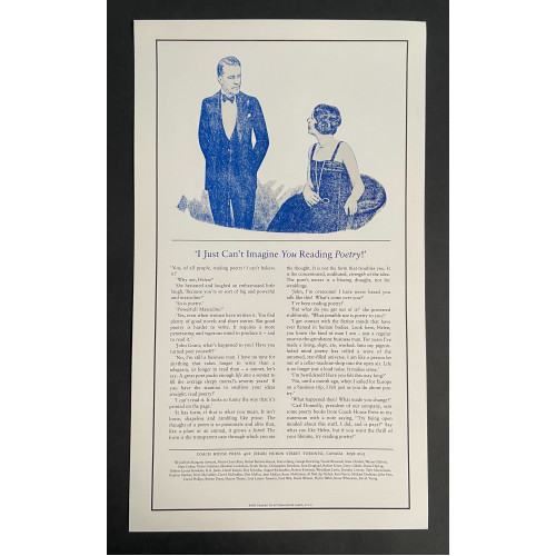 Coach House Press: I Just Can't Imagine You Reading Poetry! [Promotional Poster]. Toronto: The Coach House Press, no date. Broadside. Fine.